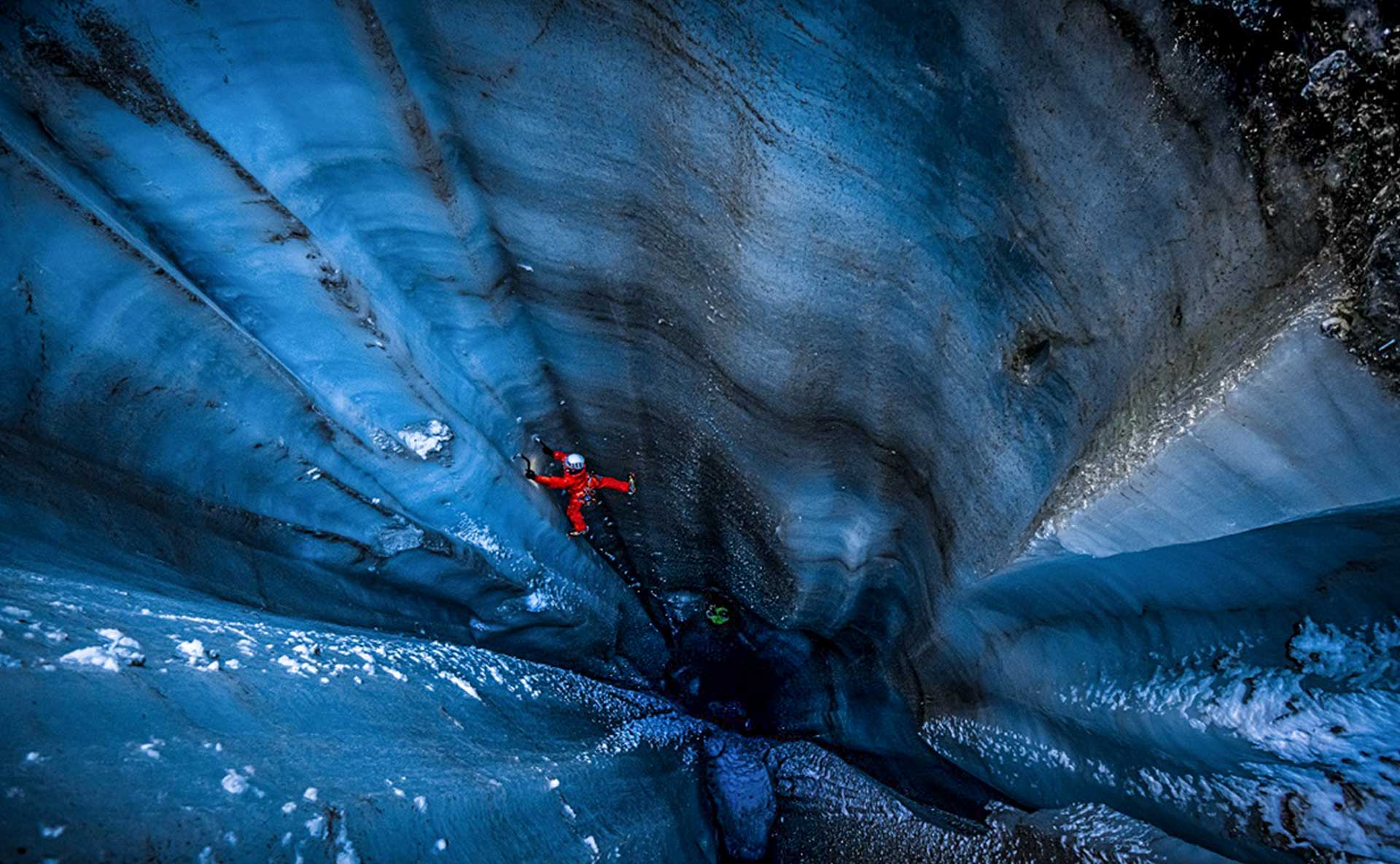 En su foto premiada de arriba se ve al montañista Jeff Mercier escalando una profunda grieta formada por agua de deshielo de verano, dentro de Mer de Glace, un glaciar de la ladera norte del macizo del Mont Blanc, en los Alpes franceses, de unos 7 kilómetros de largo y 200 metros de profundidad. Es, de hecho, el glaciar más largo de Francia.