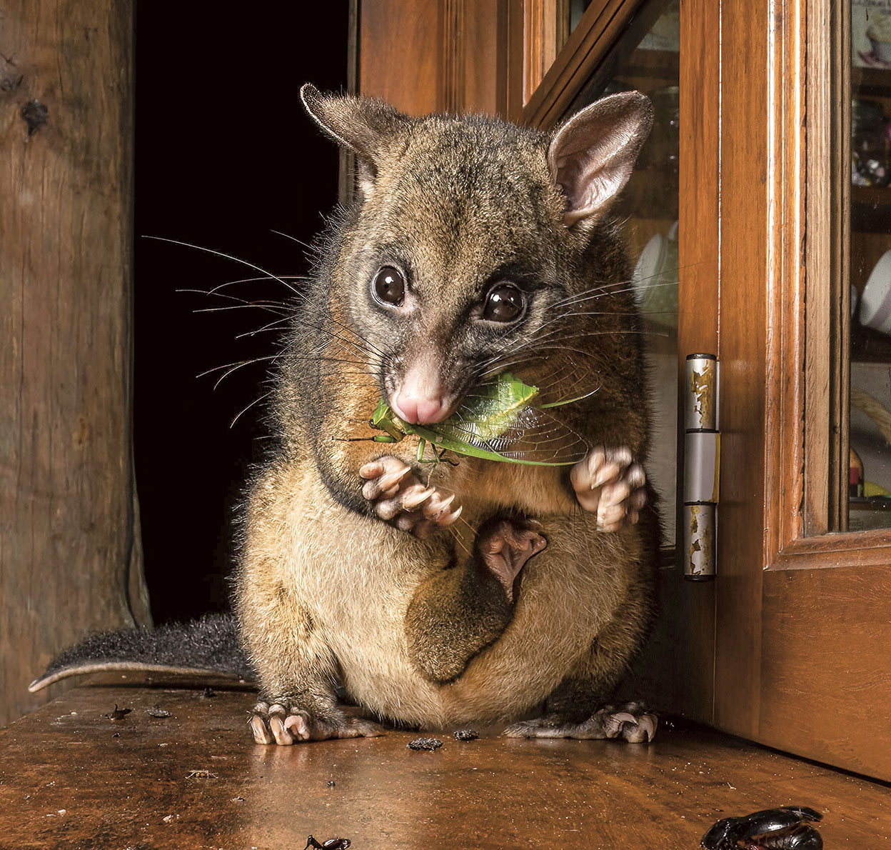 Cómo se adaptan de bien las zarigüeyas australianas. Son arbóreas (tienen garras como garfios perfectos para trepar), pero se cuelan en todas partes. De hecho, se las considera una plaga y están clasificadas como especie invasora dañina. Incluso están creando problemas en algunas ciudades. Esta se ha presentado en casa de la fotógrafa Caitlin Henderson, en Queensland, con su cría en la bolsa (son marsupiales) y se ha cenado allí una cigarra (son también noctámbulas y omnívoras). Y de paso le ha proporcionado a la autora de la imagen uno de los premios Fotógrafo de Vida Silvestre del Año, que otorga el Museo de Historia Natural de Londres.