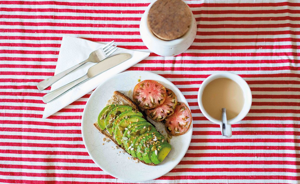 «Un café con leche de avena y una rebanada de pan rico, de masa madre, tostada, con tomate y aguacate y encima unas lonchas de jamón ibérico».