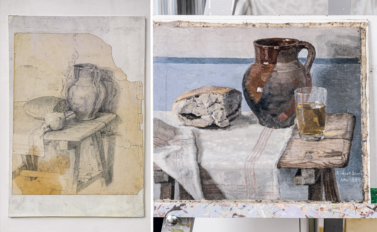 Antonio López conserva el primer dibujo y el primer óleo que hizo con 13 años. Ese óleo se reproduce aquí por primera vez. En el verano de 1949, en Tomelloso, el hermano de su padre que era pintor, Antonio López Torres, lo vio pintar unas copias de una revista. Le dijo que tenía que pintar del natural. Por primera vez le colocó una mesita, una servilleta, un trozo de pan… «Al principio pensaba que pintar era copiar y al poco tiempo me doy cuenta de que es otra cosa. ¿Qué cosa? Pues ahí es donde empieza la aventura de verdad del pintor. No hay una fórmula en absoluto. Tienes que hacer y sentir. Es como una relación amorosa».