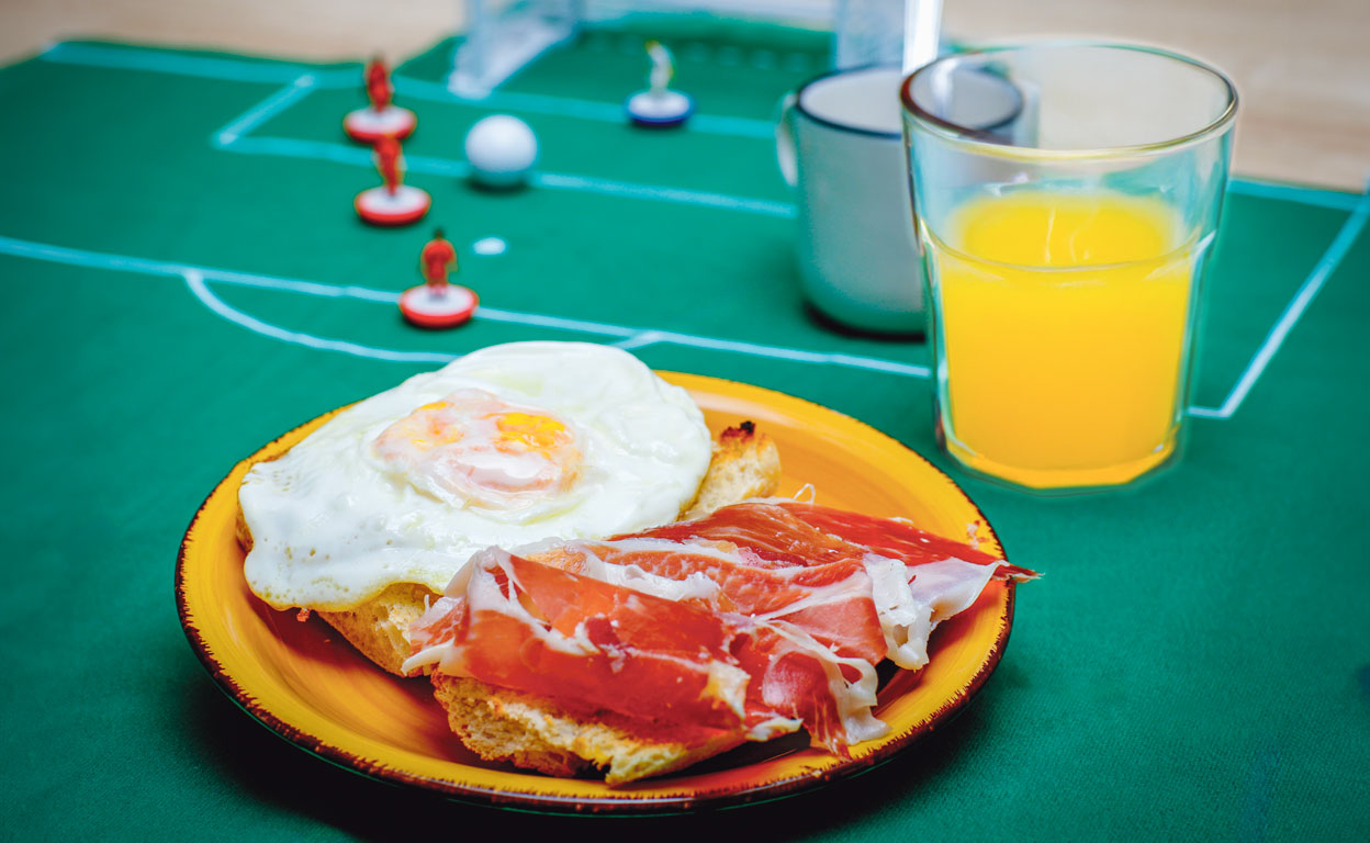 «Una tostada empapada con buen aceite de oliva virgen, unas lonchas de jamón de bellota y un huevecito frito de categoría. Zumo de naranja y café con leche».