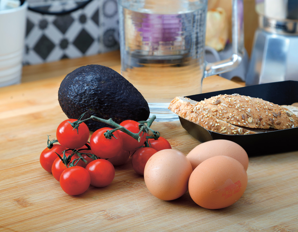 «Tres huevos a la plancha o en tortilla con jamón ibérico. Un tomatito, medio aguacate, dos rodajas de pan de trigo sarraceno y un litro de agua».